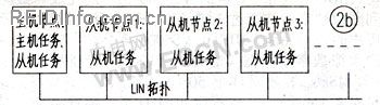 (2)LIN拓扑结构。LIN采用单主机、多从机模式,一个LIN网络包括一个主机节点和若干个从机节点(由于过多节点将导致网络阻抗过低,一个LIN网络中节点总数不宜超过16)。主机节点既包括主机任务也从机节点却只包括从机任务。图2(b)为LIN拓扑结构示意图。主机节点也可以通过网关和其他总线如CAN连接。