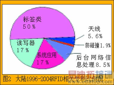 其中,读写器类占18项,标签类(包括其生产、制造、封装、应用设计以及发明)占53项,天线类6项,RFID系统应用及方法类占18项,防碰撞2项,大陆在网络应用及信息处理方面有9项专利。