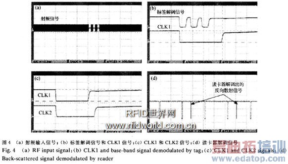 仿真结果表明,在1.6V& nbsp;电源电压下,整个模拟前端的静态工作电流为1.6μ& nbsp;A,芯片正常工作所需要的最小射频信号输入功率为45& nbsp;w,在读卡器发射功率为4W& nbsp;EIRP,标签天线增益为0dBi的情况下,对应的工作距离为7.8m.完整芯片在0.18μm& nbsp;CMOS工艺下流片验证.芯片面积为0.91mm×0.87mm.封装在λ/2偶极子天线上的标签如图3所示.完整芯片采用915MHz、与NCITS-256-1999协议兼容的读卡器进行了测试.测试结果表明,芯片各部分均正常工作,且满足设计要求.图4所示的测试波形分别为射频输入信号、标签解调信号和CLK1信号、CLK1和CLK2信号、读卡器检测到的反向散射信号.为减小示波器探头电容对于测试信号的影响,测试时均采用探头的×10衰减档,因此实际信号幅值是图中波形所示幅值的10倍.& nbsp;