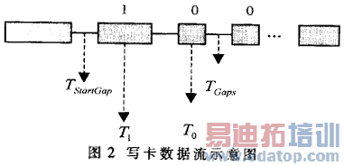 基站给射频卡发送数据时也要对数据进行编码,使数据信号加载到天线的发射信号中。TEMIC系列射频卡的基站芯片使用一种改变发射天线负载的方式对信号进行编码。这可以通过打开、关断天线(即把CFE(2)管脚设置为高、低电子)产生短暂的RF信号间隔(gap)来把RF信号分割成不同长短的区间的方法对数据进行编码。起始间隔(Start Gap)一般比数据间的间隔略长、用来与射频卡同步。一般起始间隔TStartGap =330μs,数据间间隔TGaps=300μs。在发送数据时,一个时间长度大约为To=1001xs的RF区间表示数据为0,一个时间长度大约为T1=350μs的RF区间表示数据为1。在编写程序时可以使用延时中断RF区域的方法进行发送数据。写卡时基站发送给卡片的数据流(RF区域状态)如图2所示。