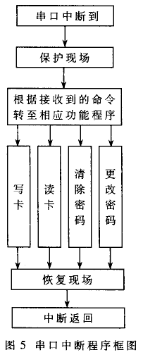 串口中断程序模块执行的功能主要是根据计算机发出的命令进行相应的操作(读卡、写卡、取消密码和更改密码等)。串口中断程序框图如图5所示。
