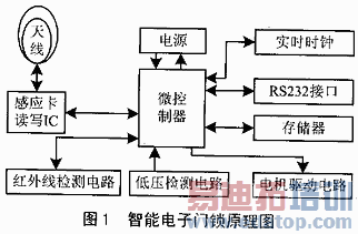 智能电子门锁的原理如图1所示。微控制器(MCU)采用美国Microchip公司的8位微控制器(PIC16F73)。红外线检测电路的作用是探测有无感应卡靠近,每隔一定时间,发射电路会自动射红外线信号,如有物体靠近,接收电路就会收到反射回来的红外线信号,并立即通知MCU进行读卡操作。感应卡读写IC在MCU驱动下,对感应卡进行读操作,然后将读到的数据曼彻斯特码形式返回给MCU,由MCU通过程序解码;将解码后的卡上数据与存储器中存放的锁内参数进行核验,并依据当前时间,确定是否是有效卡;如果有效卡,则启动电机驱动电路开锁,同时将相关信息(开锁记录)存入存储器。MCU通过RS232接口与手持式POS机进行通信,从POS机接收各种设置数据、校对时间等;在必要时可将锁内存放的开锁记录传送给POS机,然后传递到电脑,进行统计分析。低电压检测 电路自动对电池电压进行监测,一旦电池电压下降到规定值,立即通知MCU,由MCU启动黄色低电压提示LED,提醒客户尽快地换电池。电源电路在控制功耗方面起着重要作用。它在MCU的控制下为包括MCU在内各部分电路提供电源,并可以在不同状态下,根据实际需要改变电压值,从而使总体功耗保持最低,延长电池使用寿命。