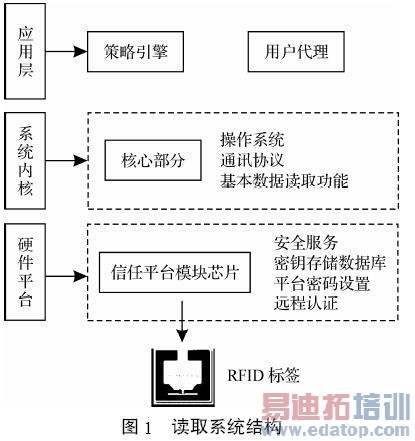 位, 是由MD5 加密方式根据不同的锁定策略对应于标签ID加密后的值,不同的锁定策略所代表的标记不同的y y[4]. 比如在超市购物时当用读取器读取的标签锁策略是“只能读取此标签ID所链接的商品价格”,则读取器就无法读取除价格外的任何其他信息,购买商品后,商家会给于该商品的解码方式,然后用户可以用自己的合法介质(比如信用卡,手机,PDA等)再对标签进行加锁,用来防止用户私人信息被周边的人窃取,当然也可以用介质对商品内容本身进行加密. 当用户回到自己家时,通过相应介质提供的解密方式进行解锁. 如果商品内容没有被加密,就可以让家里的任何设备读取相应的商品信息,从而做出相应的动作. 比如家里的烤箱读取需要烤制商品关于如何进行烤制的信息后,就自动调节温度和时间,从而自动地为用户烤制食物. 系统的信任平台模块能够在准备读取信息时,先判断RFID标签是否加锁(没有加锁将发出警报),然后分析加的是什么锁(即采用何种锁策略),并根据策略引擎解读相应的策略,读取标签中相应的信息.