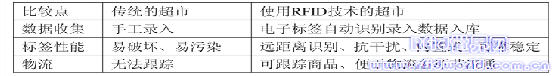 实现的功能:入库信息的统计,货架信息的统计,售出信息的统计,查询商品信息。对比传统经营的超市与采用电子标签技术的超市由下表可以发现RFID技术较为突出