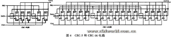 UHF RFID系统采用循环冗余校验(CRC校验)来判断数据的有效性和完整性,CRC校验可以保护读写器发出的RjT (reader to tag)命令和标签反向散射的TjR (tag to reader)序列。从数学角度来看,CRC校验是用将被处理的数据字节当作一个二进制多项式A ( )的系数,该系数除以发送方和接收方预先约定好的生成多项式g ( )后,将求得的余数P ( )作为CRC校验码。CRC的计算包括了要计算其CRC值的数据字节以及所有前面的数据字节的CRC值。当一个数据块被传输时,数据发送方计算此数据块的CRC校验码,并将此校验码附在数据块后一起传输。数据接收方计算所有接收数据的CRC值,其结果总是零,否则在传输过程中一定出现了传输错误。用零校验可以很容易地分析数据的完整性,避免代价很高的校验和比较过程。协议中采用线性反馈移位寄存器来实现CRC校验,CRC.5校验和CRC.16校验的电路示意图如图4所示。