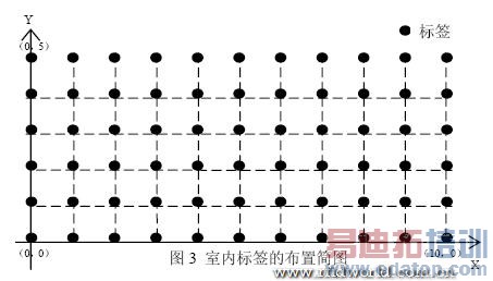 图3 为室内标签布置简图,把他们用坐标轴划分成格子形式,他们之间的间隔距离为1米,如图每个标签的坐标都已知,当装有读写器的移动机器人在该区域内运动,就可以读取到格子内邻近的4 个标签,通过标签的信息进而得知邻近4 个坐标值,根据RSSI 得到与标签的相对距离就可以计算出机器人的坐标位置,如图2。