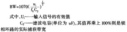 LM567的第5、6脚外接的电阻、电容决定了IC内部压控振荡器的中心频率,fo=1/1.1RC。第1、2脚通常图4锁相环电路是分别对地接电容,形成输出滤波网络和环路低通滤波网络,其中第2脚所接电容决定锁相环电路的捕捉带宽,带宽的理论值可用此公式计算: