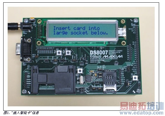 DS8007评估板出厂时已装有本智能卡交易实例的软件。若要验证是否安装了该软件,可以给评估板通电然后观察显示屏。如果显示屏上出现"在下面的大插槽中插入智能卡" (图1),则表明已经加载了程序。如果没有显示这条信息,则可通过MTK软件将交易软件装载到板上的电池备份SRAM中。应用笔记4036 (参看上文)说明了如何装载应用程序。要装载的文件为Trans.hex,包含在AN4120_SW.zip中,可从上面提到的ftp网站下载。