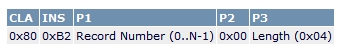 读记录命令可从当前所选文件的已识别记录中读取指定数量的字节。它是一个5字节命令,格式为: