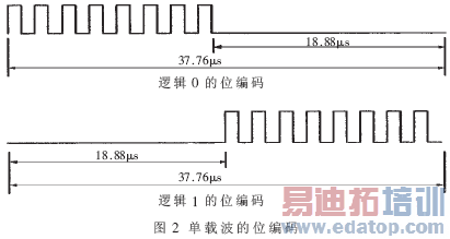 单载波的位编码如图2所示。逻辑0由8个频率为Fc/32的脉冲开始,然后是一段长度为18.88μs的未调制时间;而逻辑1则由一段长度为18.88μs的未调制时间开始,然后是8个频率为Fc/32的脉冲。编码一位数据所用的时间为37.76μs。