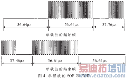 双载波的SOF和EOF如图5所示。双载波的SOF包括27个频率为Fc/28的脉冲、24个频率为Fc/32的脉冲、逻辑1的位编码;而EOF亦包括三个部分:逻辑0的位编码、24个频率为Fc/32的脉冲、27个频率为Fc/28的脉冲。