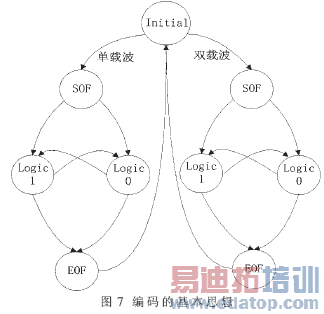 (1)系统复位后,模块处于Initial状态。在此状态中,根据Send_one_dual和 Send_data_en两个信号的值判断下一个状态,Send_data_en信号决定是否进入编码状态,Send_one_dual信号决定进入单载波模式还是双载波模式,Send_data_en信号无效时,保持原状态不变,否则进入SOF状态。