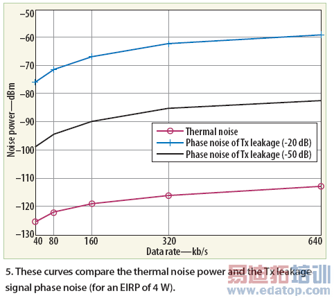 由于范围关联导致的相位噪声下降还取决于滤波器带宽。在160kb/s数据速率条件下测得的相位噪声减少值如参考文献6中所示。测得的值是41dB,几乎与本文报告的结果相同。如图5所示,Tx泄漏信号的相位噪声电平要高于热噪声,以至于RIR主要取决于Tx/Rx隔离度,并证实了作者的假设-Tx泄漏信号的相位噪声是决定RIR的主导因素。对于闭环锁相环(PLL)来说,相位噪声的功率谱密度将经过PLL传输函数的过滤,因此相位噪声效应会变得小许多。这样,针对开环压控振荡器(VCO)的结果就代表了最坏情况。