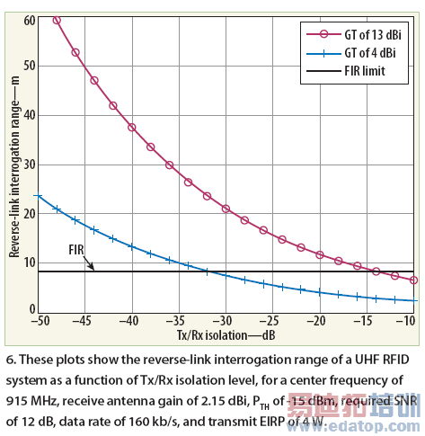图6也显示了阅读机天线增益对询问距离的依赖性。在相同的EIRP下,RIR计算中使用了13dBi和4dBi的不同天线增益值。在天线增益为13dBi的情况下的RFID阅读机发射功率要低于4dBi增益时的功率。因为增加发射机功率也会导致Tx泄漏功率增加,因此在增加RIR方面13dBi的天线增益案例要比4dBi天线增益案例更加有效。作者认为这些结果有助于确定Tx/Rx隔离度和VCO相位噪声等UHF RFID阅读机规范。