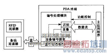 PDA与条码,RFID阅读器通信原理如图1。条形码扫描器识别条形码时,根据不同颜色的物体,其反射的可见光的波长不同,条码扫描器的光电转换器接收到与白条和黑条相应的强弱不同的反射光信号,并转换成相应的电信号输出到条码扫描器的放大整形电路,把模拟信号转换成数字电信号,根据码制所对应的编码规则,条码扫描器便可将条形符号换成相应的数字、字符信息,形成物体的编号。