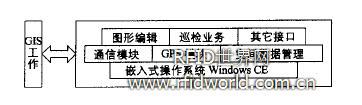 嵌入式GIS系统应用软件的系统结构因具体应用的不同而有所增减。如图2所示为嵌入式GIS系统应用软件所应具备的几个基本功能模块。通常该类系统最底层应为嵌入式操作系统Windows CE,然后上面依次为核心处理层和应用逻辑层。整个体系结构与GIS工作站和WebGis系统进行数据交互,便于进行业务裁剪和对外发布。