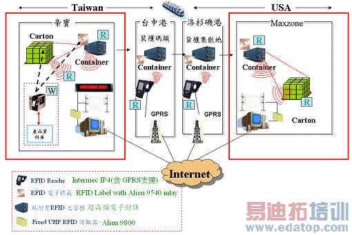 本系统导入预期希望协助北美于产品进货接收时,能快速获知该货柜内含之成品箱相关资讯,并协助进货人员快速正确地进行拆柜作业,且建立台湾出货至北美发货仓进货作一完整应用,以协助未来有效掌握货品运送情形。除此之外,其能达成1.提升货运追踪与内容查询能力、2.物流中心进货时可整批进货读取、3.可强化保全功能,减少货物失窃危机、4.认证及防制盗用的工具,减少大量仿冒品,保护厂商商标与智慧财产权等。图1是RFID成品出货及货柜物流Hub系统的示意图。