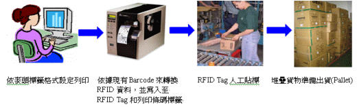 由产品资料库中依所要出货的通知单号经由标签列印管制系统自动编号产生唯一RFID正/侧麦头标签,本计划RFID印表机则是采用Zebra R110Xi,套用一般纸箱最常使用的4*6吋Alien 9540 Tag,由于RFID要取代原正/侧麦头标签,因此须在4*6吋Alien 9540 Tag中间再切一刀,原构想只是请工厂加工切怎样一刀不须花多少钱,等厂商报价竟须花一笔上万不小的开模费,要不是合作厂商鼎力到处拜托寻找,不然在数量不多情况下势必得花一笔钱定制。图2为标签列印与人工贴标。