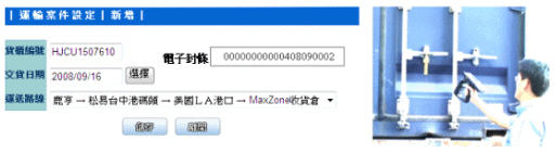 首先在运输案件中将新增一笔资讯,包含出货货柜编号与电子封条的对应关系,并且设定此货柜运送行进的路线。当在出货区已完成所有货品读取,最后将扣上被动式电子封条,并且透过PDA读取再次作检核动作确保资讯的完整性,将所读取的Tag ID经由GPRS即时传回至后端系统,让管理者可随时追踪目前货柜所在位址,现阶段所在位址是经由人工在PDA上选取,后续将精进PDA结合GPS传回座标并显示于后端GIS地图上,能同时追踪所有货柜座落的地理位置。图4为新增运输案件的编辑页面与货柜电子封条检核。 (本案PDA是采用Intermec IP4 + Intermec 761;被动式电子封条则是采用辰皓公司所推出二款符合C1Gen2的Tag: Alien 9540和NXP,其中以NXP读取效能为佳)