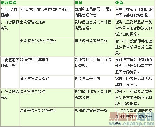表1、RFID成品出货管理及货柜追踪系统导入绩效指标评估表