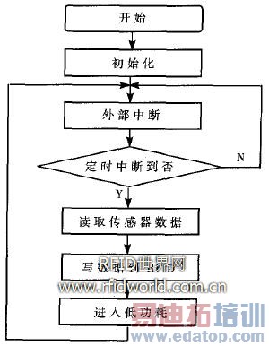 系统软件采用C语言编程设计,软件流程图如图6所示,主控制器采用中断方式进行工作,每隔一定时间从传感器中读出数据,再通过同步串行接口(SPI)得到RFID 卡中写入数据的地址,然后将需要写入的温湿数据发送给读写器,写入RFID卡,最后进入低功耗状态。