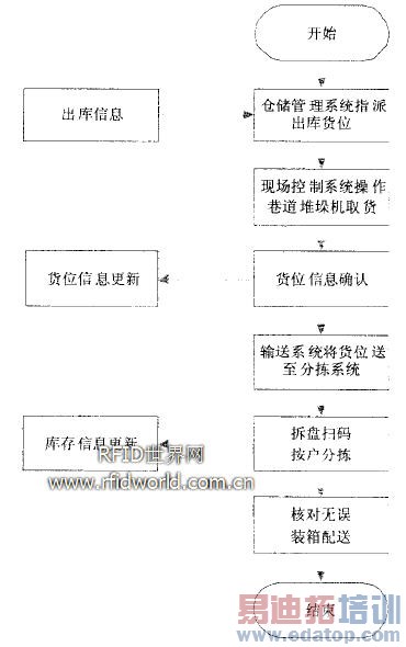 当有出库要求时.仓储管理系统根据库存状况和出库规则确定应出库货物的位置,将出库信息(如出库货物名称、数量、存放位置等)传输至现场控制系统。现场控制系统驱动巷道堆垛机运行至指定货位,RFID读写器自动扫描货位标签,进行确认,完成货位信息更新 无误后堆垛机将货物送至分拣系统一在分拣系统进行拆盘操作,托盘归位。件烟或条烟按户进行分拣扫码,扫码信息传输至仓储管理系统,完成库存数据更新。分拣工作人员对分拣完毕的卷烟核对无误后,在分拣终端使用RFID读写器对周转箱标签写入相应的数据, 准备装车配送。出库作业完成送货完毕,送货人员将周转箱送回仓库,仓储人员再次扫描周转箱标签。标签信息清空,以备下次使用。周转箱具有可雨复利用、可折叠、可减少货损货差、环保无污染等优点。出库业务流程见图5