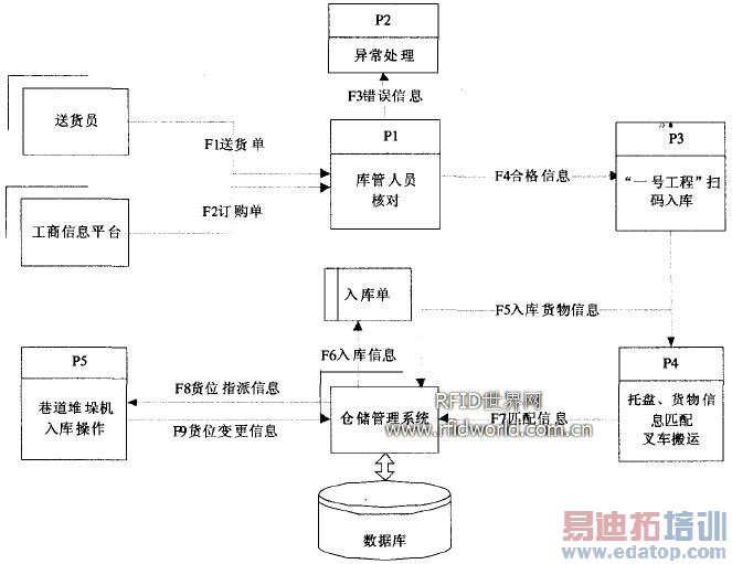 送货车辆到达入库台,仓库管理人员首先对送货单进行核对,核对无误后通过“一号工程”经行入库扫码,采集商品信息