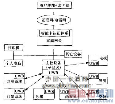 嵌入在家庭网关的智能卡认证体系储存着与智能卡(用户携带)相匹配的信息,用户从远端登陆家庭网关时,只有匹配的智能卡通过认证并输入用户确认密码后, 用户才有权对家有电器进行操控。智能卡系统的信息是可以变更的,而且只能是合法用户才可更改其中身份信息。身份信息也是多样的,可以是指纹信息、视网膜信息、语音信息 等等,用户可以经常变更身份信息或使用多重身份信息以提高家庭网络的安全性能。主控设备(子网关)是家电控制子网连接到家庭网关的物理接口。子网关实现家电控制子网中的信息传输设备的互联,同时为各种接入设备提供与家庭网关的接口,使各子网设备可以获得各种服务 。家庭主网网关和子网关在物理上可以是同一实体。主控设备(子网关)主要具有以下功能:①给出友好的人机界面。用户可以进入任一个电器的控制选项界面,控制各个家庭控制子网设备,操作简单;②管理各种家庭控制子网设备的添加和删除。当新的设备加入到家庭控制子网网络系统时,子网关可以通过添加设备文件来添加新的设备,同时具有删除设备的功能;③与各个通信模块进行数据交换。通信模块(UWB模块)是家电控制子网设备的通信核心,是子网设备的通信接口单元,支持家电控制子网内部各个设备与子网关之间的数据通信,即插即用,用户可以直观地操作和控制各个家电控制子网设备。