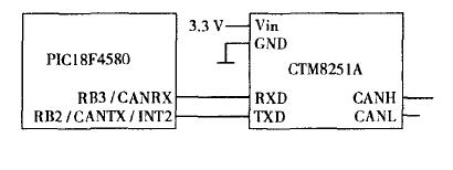 2.1 PICl8F458O与CTM825lA 的接口电路PIC18F4580带有CAN控制模块,支持CAN1.2、CAN2.0A、CAN2.0B协议,只需外接CAN驱动器即可实现CAN模块的硬件设计,接口电路如图3所示。CAN发器芯片CTM8251A具有DC 2 500 V隔离功能,符合ISO 11898标准,数据速率最高达1Mbps,具有自动热关断保护功能,并且未上电或欠压节点不会影响CAN总线的正常工作。