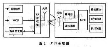 典型的射频识别系统的工作原理如下:系统通电工作后,读出器通过其内部的线圈周期性地发出一个固有频率的电磁波(激发信号)。当射频识别卡放在读出器的感应范围内时,卡内的线圈在“激发信号”的感应下产生微弱电流作为卡内集成芯片的电源。卡片上电复位后,原本处于“休眠状态”的卡片被激活并将含有自身种类识别码标志、制造商标志等信息代码调制到载波上,经卡内天线发射出去。读卡模块将接收到的无线信号传给现场控制器,由现场控制器进行信号处理并对执行装置发出指令。读出器采用微处理器控制,通过韦根一485转换模块实现与主控机之间的信息交流,其原理框图如图1所示。