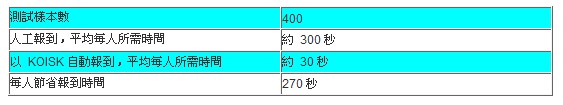 为期5日的IDEAS Week,因为开放学员免费报名,主办单位又力邀网路超人气作家九把刀等共襄盛举,不但与会学员众多,当场往来嘉宾也多,KOISK自动报到可助主办单位在人力调派上可以更精简,根据实测结果(如表3所示),平均报到时间降为1/10,平均每人仅需30秒即可完成报到手续。