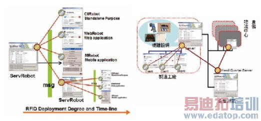 因此,先导计划是一个很好的起头方式,但是后续的全盘计划也需要一并考量与进行,才不会功亏一篑。因此,RFID系统的复制与扩充常是Bottom-Up的形式(如图3左所示),同时具有平行复制,也需要垂直整合(如图3右所示)。在规划的同时,就已经要考虑复制与扩充的可行性。举例来说,先导计划也许在仓库的其中一个门进行采用C1G2的成效。当验证成功后,每一个门的经验复制可以水平扩充RFID系统的效益。而企业总部也许有多个仓库,因此必须将每个仓库的资料集合汇集到企业总部(如图3所示)。同时,不只是仓储应用,连同制造、仓储、销售、服务都可以串连起来,这时,再来讨论有没有效益也不迟!导入系统虽不是赌博,但将一张标签的效益发挥到淋漓尽致,是稳赢不输的。