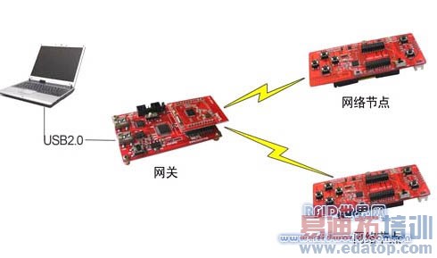 DIYRF-2510构架的低功耗无线网络结构图如图4所示。一根USB电缆,连接网关节点到PC机,将网关通过无线网络获得的信息或者PC发出的命令,通过无线网络传输到节点。