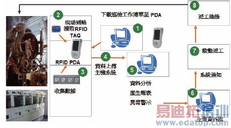 目前经常被采用的巡检作业管理模式,是在巡检点装设RFID Tag来取代传统签名记录的方式,这种应用方式国内的警察机关也有相同的应用案例。藉由巡检人员手持PDA以非接触式感应装置于设备与场所上的RFID Tag,自动记录时间,并显示现场巡检设备及相关记录项目资讯,工作人员资讯收集回传主机后,可产生分析报表或针对需维护的设备自动产生派工(如图2)。采用自动化作业方式,可降低操作人员工作负担,快速有效率完成工作;同时透过自动记录到达时间及地点,提高管理人员对于现场作业之掌控度。