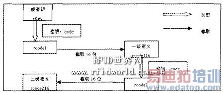 由根卡持卡人输入8字节的密码cOde,用COde对根密钥进行加密得到rcodel,截取rcodel前面16位作为一级密文rcodel 16,然后再用COde对rcodel 16进行加密得到rcode2,截取rcode2前面l6位作为二级密文rcode216,将rcodel 16和rcode2l6写入根卡指定位置,完成根卡的生成。具体流程如图3所示。