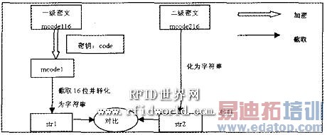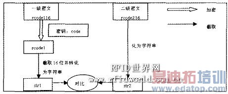从根卡中指定位置获得根卡的一级密文rcodel 16和二级密文rcode216,用根卡持卡人输入的8字节密码对一级密文rcodel 16进行加密得到rcodel,截取rcodel的前面l6位并将其转化为字符串strl, 将二级密文rcode216转化为字符串str2,比较strl和str2,若相等,则根卡验证成功,反之失败。具体流程如图4所示。