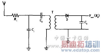 本无线定位系统的车载卡采用电池供电, 而电池是一种消耗性的电源,工作时间短。为了延长车载卡的工作时间,需要进行电源管理,以降低功耗。当前大多数的电源管理方法采用一种周密设计的唤醒、休眠方法。但大多数情况下,唤醒周期的大部分时间是徒劳无用的, 消耗能量。本系统中采用一种无线触发唤醒的电源管理方法。在这种方法中,车载卡进人休眠模式后就会一直保持睡眠状态,在读写器没有发送出特定频率的无线信号时,它是不会被唤醒的。当然,这个特定频率的无线信号会立即地唤醒休眠的车载卡。这样,就节省了在唤醒前和监测期间的电源消耗。唤醒脉冲通过特定频率传送,而数据通信采用另外的无线频率传送。一旦读写器与标签建立通信连接后,双方便跳到由读写器指定的固定频率上工作,这样, 即使车场中其它标签在无线通信范围内也不会被唤醒,避免了同频干扰。无线触发唤醒电路主要由无源元件构成,其基本电路图如图2所示。