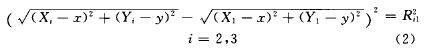 采用到达时间差(TD0A)算法是通过测量不同读写器接收到同一标签的定位信号的时间差,并由此计算出标签到不同读写器间的距离差。标签到任何两个读写器的距离差D为定值,标签必定位于以两个读写器为焦点的双曲线上, 当同时有N个读头参与测距时(N≥ 3), 由多个双曲线之间的交汇区域就是对标签位置的估计。TDOA 只是测量各读写器接收到同一标签定位信号的到达时间差,参加定位的各个读写器在时间上不要求严格同步。假定测量第i个读写器和第j个读写器的到达时间分别为TA i和TA j,那么信号到达第i个和第j个读写器的时间差就是TAji =TAi -TAj。它们的距离差Rji=C*TAji则标签坐标与读写器坐标存在如下关系: