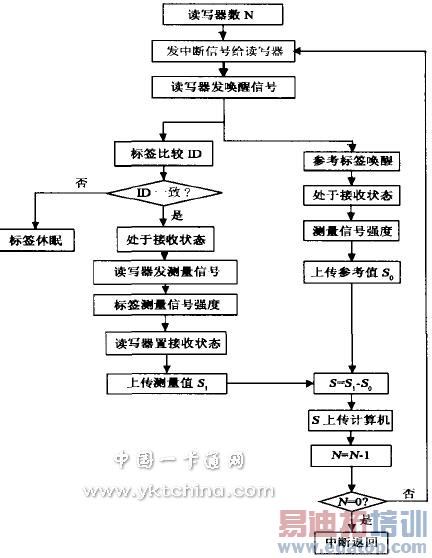 系统的定位解算软件构架分为基于信号强度的定位算法和到达时间差定位算法二个模块,二者过程相似,只是测算对象不同在到达时间差定位算法过程中,不需要唤醒参考标签,只有待定位标签向读写器发送信号,保持只有一个标签发信号;基于信号强度的定位算法过程中,首先在标签上完成信号强度的测量,然后再上传给计算机系统,将信号强度信息转化为几何距离,解算出待定位标签的位置数据,在信号强度的测算过程中保持只有一个读写器工作。基于信号强度的程序框图如图4所示。