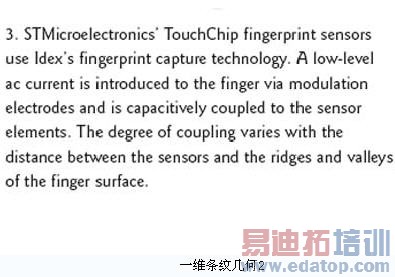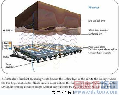 AuthenTec公司的AES2810低功耗指纹认证传感器适合于笔记本电脑。据该公司称,其第一颗单芯片传感器集成了基于RF的专利传感器、硬件安全模块以及匹配引擎,该引擎可以执行128位加密和解密。操作基于AuthenTec的TruePrint表面下指纹识别技术,该技术可以在各种条件下读取任何人的指纹图(图2)。