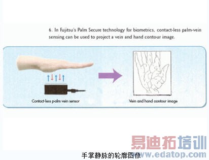 日立公司开发了用于门把手的手柄式手指静脉认证技术,实现了安全门禁控制。Techsphere还提供了用于安全访问控制的手掌血管图形识别生物识别技术。富士通成立了非接触式手掌静脉识别部门,该部分识别独特的手掌静脉的轮廓图像(图6)。此外,Identica公司的血管图形扫描仪扫描一个人手背皮肤下面的静脉。
