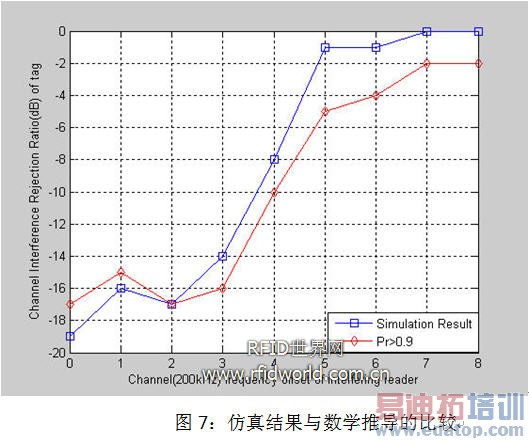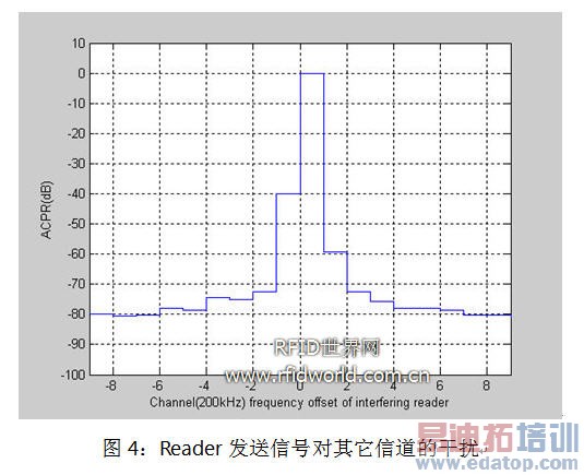 Reader可以工作在多个信道上,图3是CEPT标准下10个可用的信道。图4是工作在某个信道上的reader对相邻信道和其它的干扰情况。由此,我们可以得出,通过信道划分可以使多个reader同时正常工作。所以,Signal-to-Interference Ratio(SIR)的门限值不会产生Reader-to-Tag干扰或Reader-to-Reader干扰成为我们研究的重点。