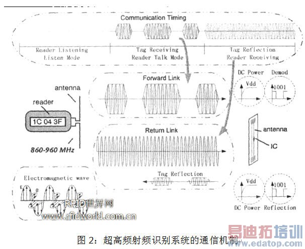 由图1所示,射频识别系统的主要内容包括阅读器和电子标签两个部分,两者之间是在阅读器和电子标签的天线以及无线信道中建立通信的。图2是射频识别系统的工作机制,阅读器和电子标签之间通过电磁波进行通信,通信的时序大体上可以分为三个阶段:阅读器的侦听模式,阅读器到标签的通信,标签到阅读器的通信。阅读器的侦听模式是阅读器先在某个工作信道上侦听是否有其他阅读器在工作,假如没有其他阅读器占用该信道,则阅读器发送一个指令给标签,然后发送一个无调制的载波,此时标签反射这个无调制的载波,从而把信息发送给阅读器。阅读器与标签之间主要为两个通信过程:第一个通信过程是阅读器发送一个调制的载波给标签,如OOK,此时电子标签从电磁波中获取能量,并解调阅读器发射的信号,得到阅读器的指令;第二个过程是标签获得阅读器的指令以后,根据指令的内容,经过标签内阅读器状态机的转换,把标签的内容通过后向散射(Backscatter )的方式传输给阅读器,而此时阅读器发送无调制的载波用以提供标签工作需要的能量,以及标签反射需要的电磁波载体。
