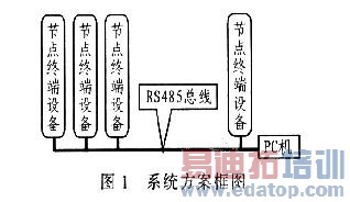该系统借鉴计算机网络中经典的C/S架构,利用RS485总线连接整个网络。其中计算机作为网络服务器,节点终端设备作为客户机。计算机向各节点终端设备发送命令控制整个网络,接收采集到的数据并做进一步处理;节点终端设备主要负责采集标签数据,响应计算机的命令。系统选用的RS485器件MAX1483使网络节点数最大可达到256个。系统方案框图如图1所示。
