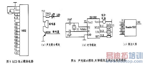 (6)其他模块1602单色液晶显示屏,可显示采集到的数据和操作时间或实时时间。显示数据的传输采用并行传输的方式,加快了屏幕的刷新频率。声光提示模块提示操作完成情况。主要通过主控器件的I/O端口控制LED闪烁和蜂鸣器的鸣笛。时钟模块显示数据采集的时间或实时时间。除板载电源外还设计有备用的纽扣电池,使掉电时时钟不丢失。调试电路实现在线编程,向主控器件C8051F340烧写程序,监测变量值的变化情况,调试程序,辅助完成软件的编写。图5、图6为上述模块的原理电路图。