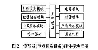 系统设计的重点在于节点终端设备的设计,即超高频RFID读写器的设计。读写器的主要功能是发出询问信号,选择能量场内的应答器,建立数据通信链路并对应答器进行读写操作。超高频RFID读写器的数据采集距离较远,可达到1~30 m,通过软件设置射频收发模块增益大小来控制读写距离,灵活地满足实际要求。读写器硬件按照不同的功能可划分为主控模块、射频收发模块、电源模块、数据存储模块、接口部分、时钟模块、LCD显示模块、声光提示模块及调试电路等,具体如图2所示。