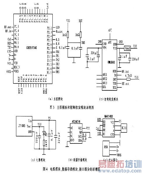 (5)接口部分RS485接口采用MAX1483器件。最多可驱动256个节点,通过RJ11接口实现与总线的连接:USB接口使用主控器件自带的USB控制器,具有很高的可靠性。图4是电源模块、数据存储模块、接口部分的原理图。