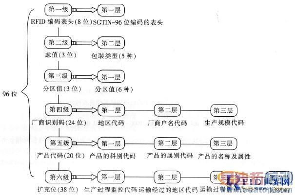 根据RFID 编码的标准要求及信息需求, 采用层级分类法, 共分为六级, 每级再根据需要和要求进行分层。选择EPC SGTIN - 96位电子标签编码, 采用二进制编码, 其结构如图1所示。