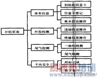 系统主要包括环保信息卡基本信息维护、机动车外观检测、汽车尾气检测和安全模块四个模块,图给出了整个系统的组成和逻辑操作流程。