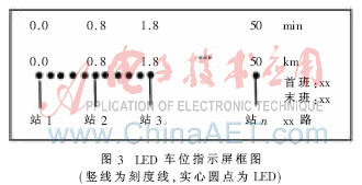 LED车位指示屏如图3所示,包括LED灯组和屏基板。屏基板上印有站名、刻度线、公里数与时间分钟数等。站名与某一刻度线对齐,在刻度线的上方标出该站距始发站的公里数与公交车的行车时间。公交线路的长度、站位置、车辆运行所需时间均固定(正常情况),故可将沿线各站距离始发站的公里数及所需行车时间标示在刻度线上。在每一条刻度线上安装一个LED,两条刻度线间设置数个LED。当公交车到达某站时,点亮与该站对应的刻度线上的LED,离站时则关闭对应刻度线上的LED,同时根据历史行车时间相继点亮本站刻度线与下一个最近站对应刻度线之间的LED。